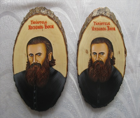 - Părintele Arsenie BOCA - Stoc 4. - Mărimea icoana stânga pe lemn cu scoarţă 15,5/30 cm = ... lei - Mărimea icoană dreapta pe lemn 13,5/28 cm = ... lei..